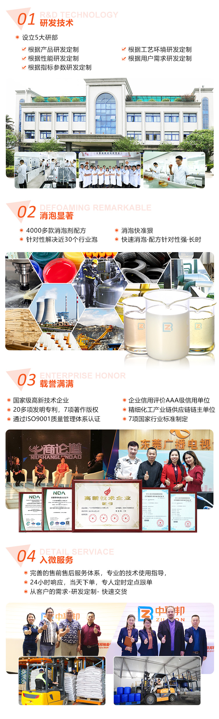 多年來(lái)公司面向市場(chǎng),面向真實(shí)各行業(yè)客戶現(xiàn)場(chǎng),對(duì)水處理消泡劑、工業(yè)消泡劑、有機(jī)硅消泡劑、發(fā)酵行業(yè)、清洗劑行業(yè)、金屬加工行業(yè)、造紙行業(yè)、建材行業(yè)、水性粘合劑行業(yè)、紡織印染行業(yè)、油田行業(yè)、水性涂料行業(yè)、印刷材料行業(yè)、電廠脫硫行業(yè)、工業(yè)清洗行業(yè)、家用化學(xué)品行業(yè)、采礦選礦工行業(yè)等32個(gè)行業(yè)工藝、流程及產(chǎn)品配方深入了解,對(duì)各行業(yè)消泡劑應(yīng)用了如指掌,給能客戶提供合適的解決方案,所研發(fā)生產(chǎn)消泡劑適應(yīng)客戶需求和市場(chǎng)需要,能輕松解決客戶遇到的難以解決的消泡難題,減少了客戶使用消泡劑的成本。公司依托完善的售前、售中及售后服務(wù),全程技術(shù)跟進(jìn)消泡劑的試樣到使用過(guò)程,節(jié)省了時(shí)間和成本,贏得了業(yè)界各類客戶們的贊譽(yù)!